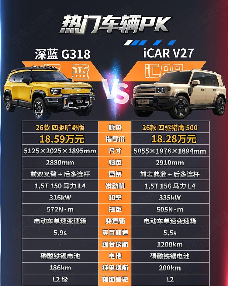 深蓝G318 2026款无忧穿越版四驱旷野版售价为18.59万元,iCAR V27 2026款200km四驱猎鹰版售价为18.28万元,两款车售价和定位都比较接近,属于20万级SUV中的精品车型,那么哪一款车更值得入手呢?
